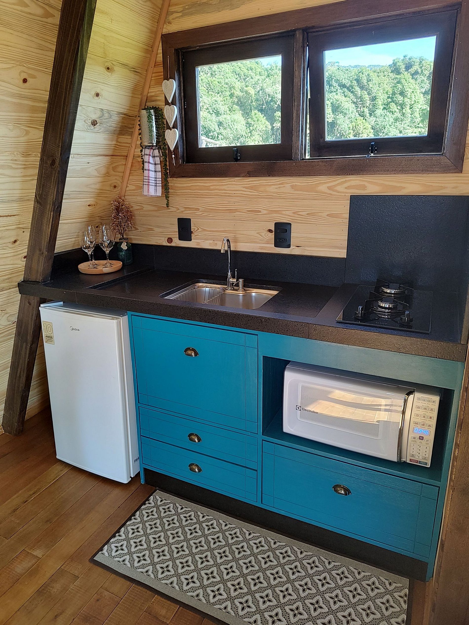 * Cozinha (fogão, pia, microondas, frigobar, pratos, talheres, taças, copos, xícaras, panelas, liquidificador)